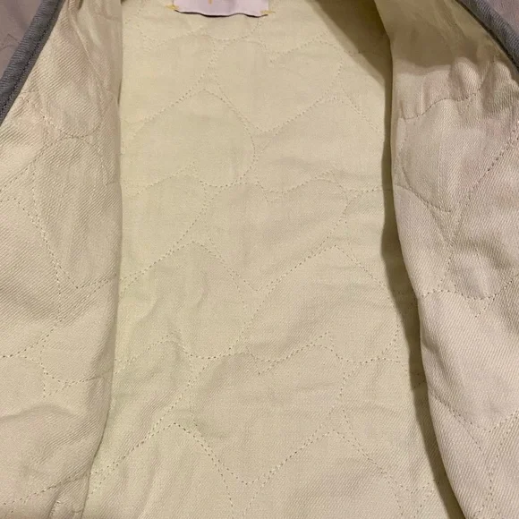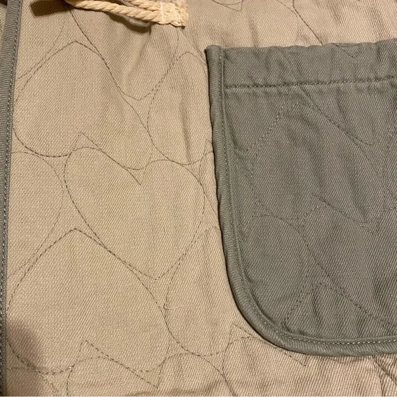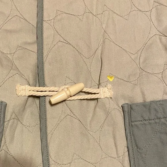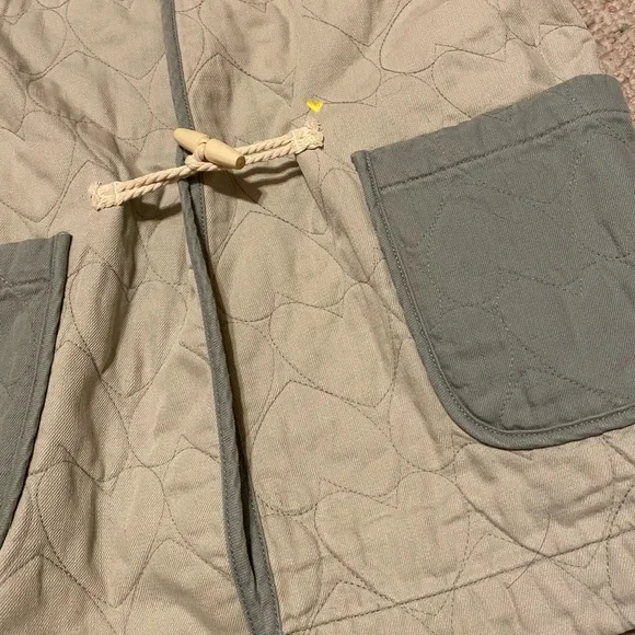 Anthropologie x Kerri Rosenthal Cotton quilted jacketMuted olive green & darker olive trim - inside is more of a pastel yellow greenOnly worn a couple times - excellent conditionHeart designDouble pocketWood toggle closureSize extra small - small depending on desired fitChest 19" flatLength 26"Sleeves 18.5" (slightly cropped)