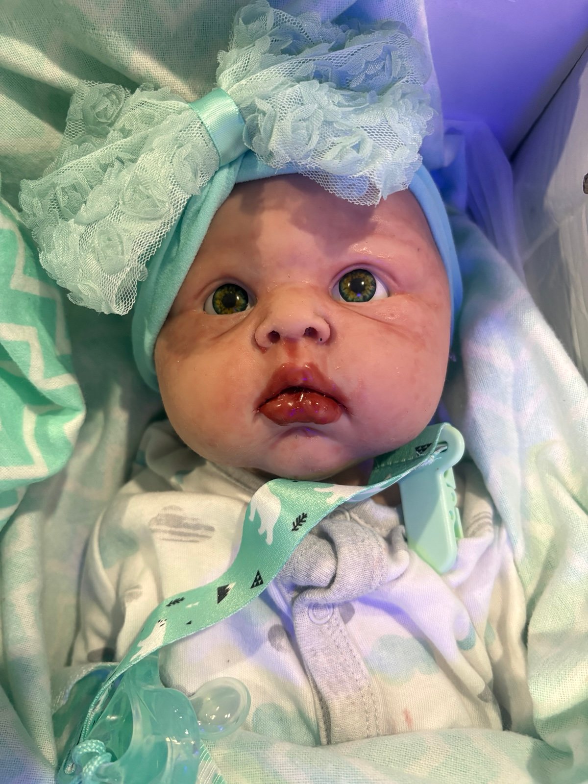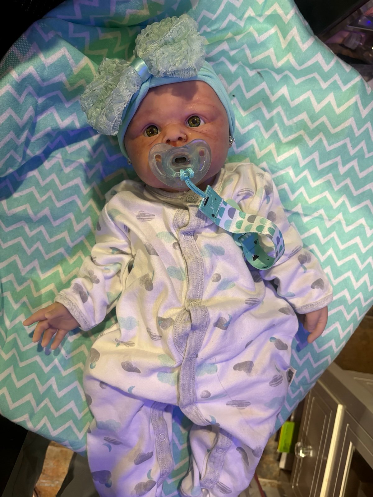 My best 5 star seller. Gorgeous AAA quality. Only 1 left. 18.5” long 7.23lbs full body platinum silicone chunky baby. super soft, real baby feel. Like a big squishy pillow. You will not want to put her down. She comes home to her new mommy with outfit in pics or of my choosing. along with pacifier and holder, zircon earrings value of $14.95 also box opening surprise. Will be packed with love. Upgraded eyes Free. All silicone babies have pour mark on top of head and might show mold marks on sides. No returns. Smoke free home. See my other listings. Thanks