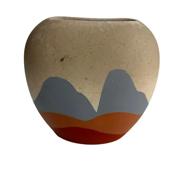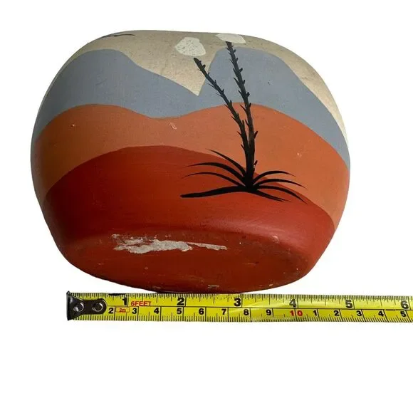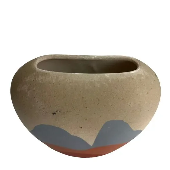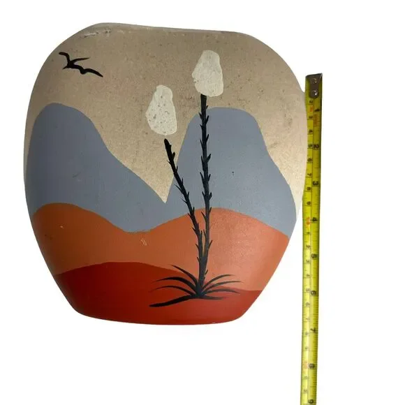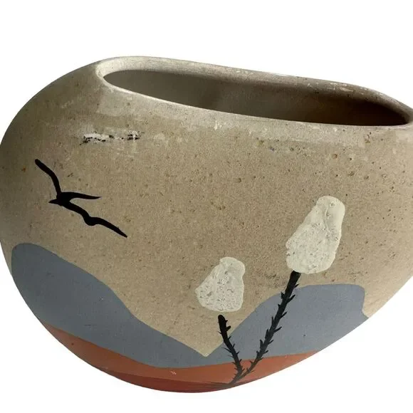 This beautiful vase is a must-have for any lover of Southwestern art. The intricate floral and bird design on a desert background is sure to add a touch of beauty to any room. Made from high-quality stoneware, it is both durable and stylish. The hand-painted finish gives it a unique and personal touch, making it a one-of-a-kind piece.The vase is an original, not a reproduction, and has no branding or backstamp. It is a decorative piece, perfect for displaying flowers or as a standalone work of art. The matte finish gives it a rustic feel, while the production technique used makes it a true work of art pottery.Has marks, see pics.As pictured.